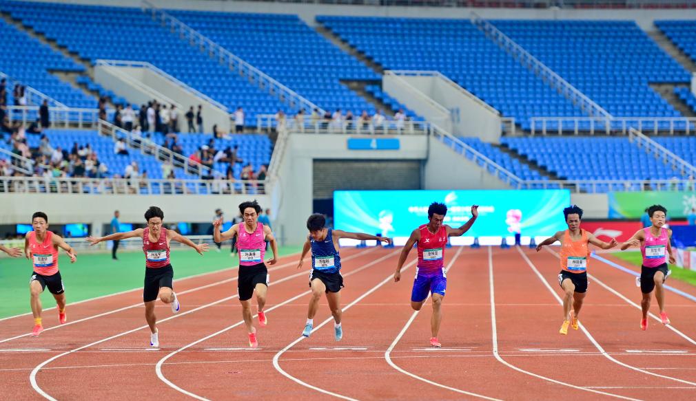 四川隊(duì)選手方俊程(中)在男子100米決賽中沖線。新華社記者 吳青昊 攝