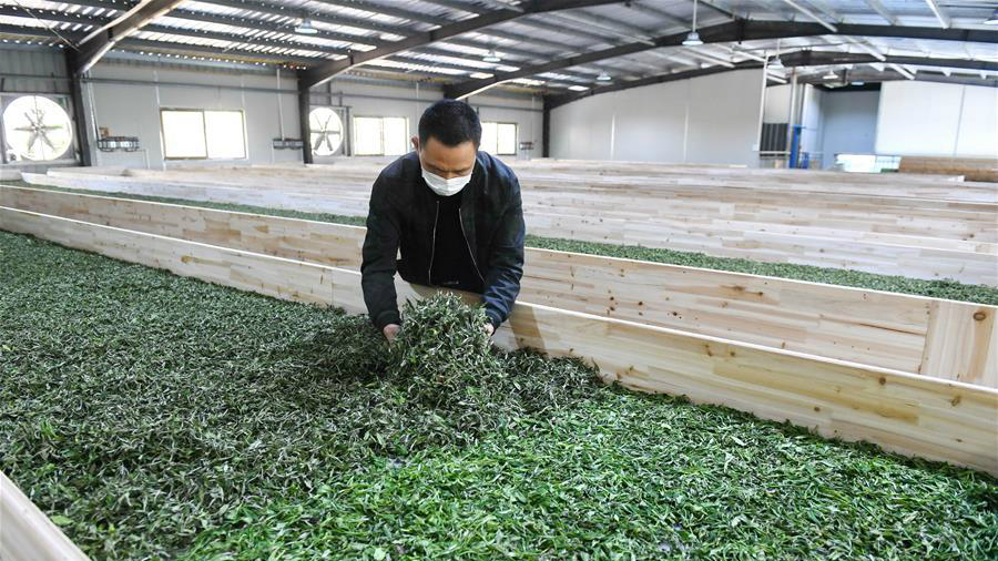 △下黨鄉(xiāng)村民在茶葉生產(chǎn)車間內(nèi)進(jìn)行壽寧白茶的曬青。