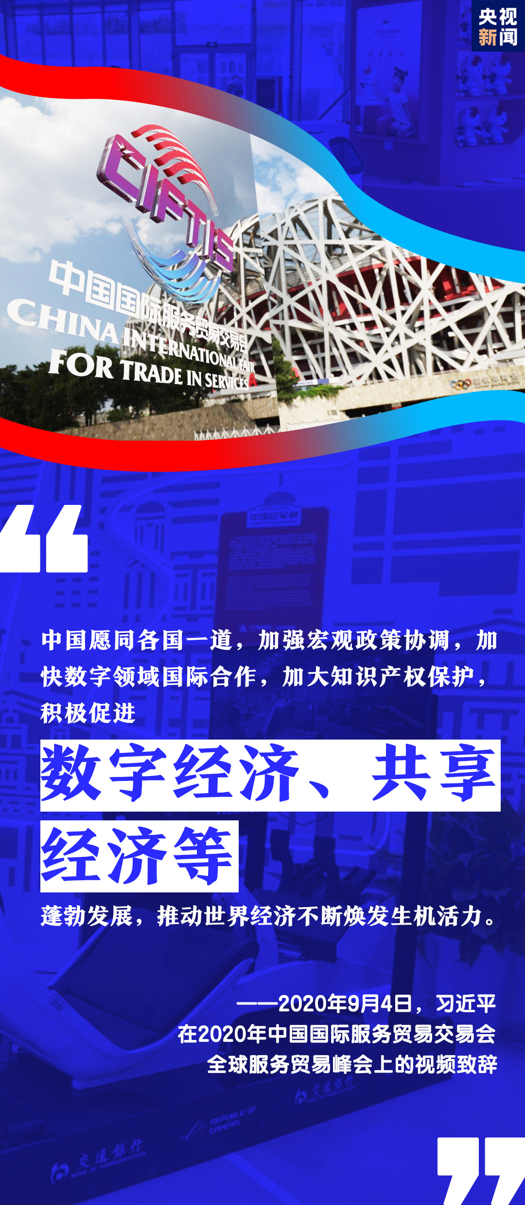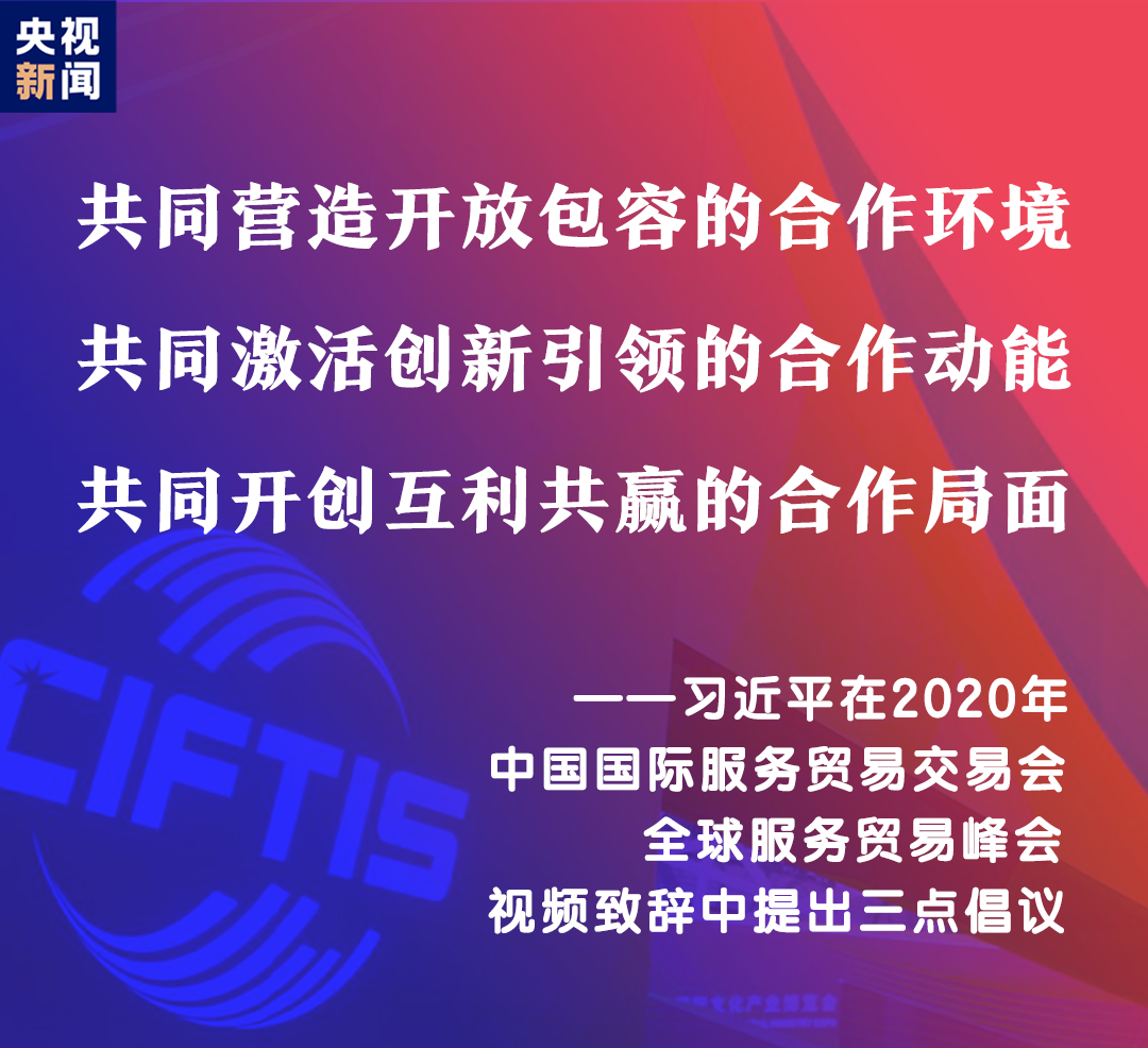 習(xí)近平表示,中國(guó)舉辦2020年中國(guó)國(guó)際服務(wù)貿(mào)易交易會(huì),就是搭建起平臺(tái)和橋梁,讓各國(guó)人民充分展示服務(wù)貿(mào)易領(lǐng)域新發(fā)展新突破,共同享受人類社會(huì)發(fā)展進(jìn)步新技術(shù)新成果。