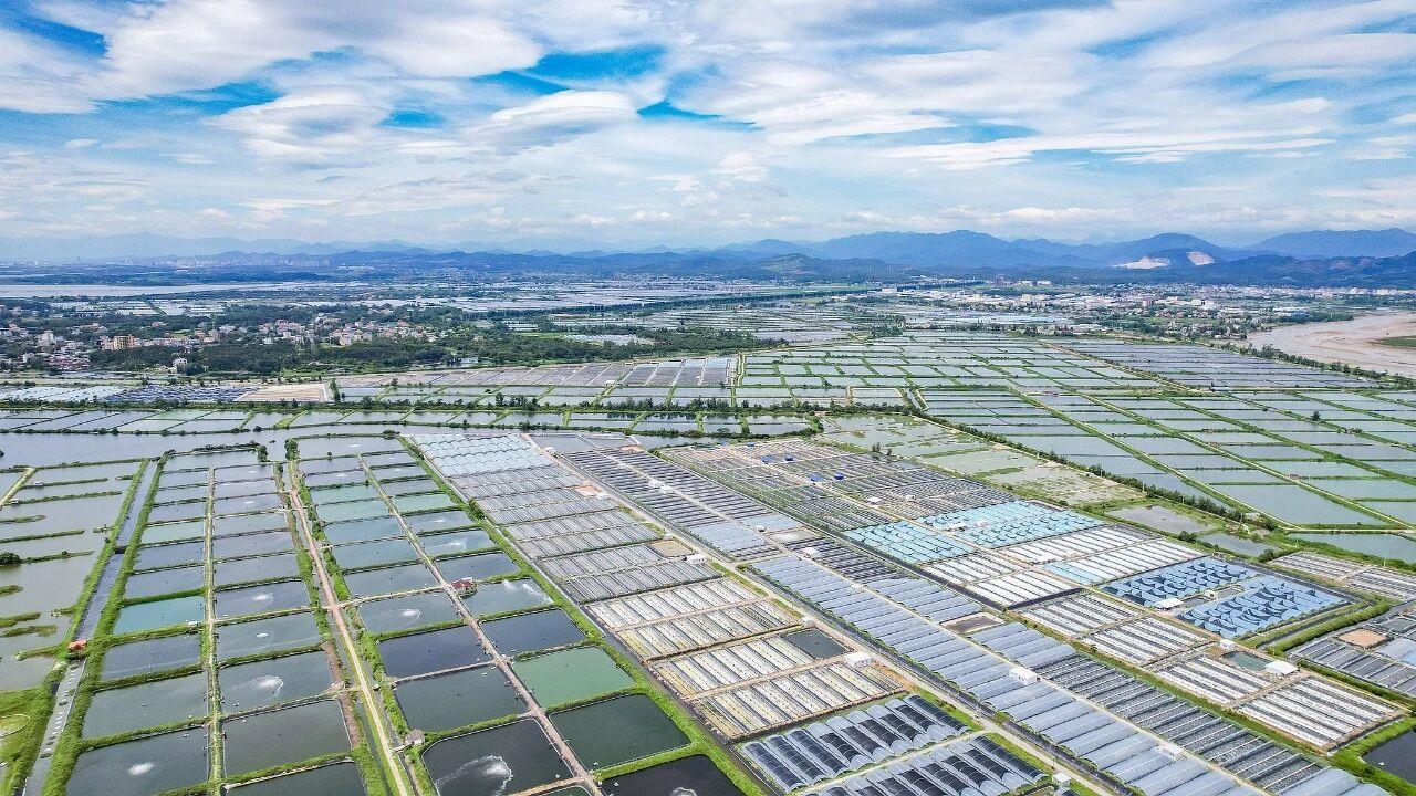 △廣西防城港東興市江平鎮(zhèn)魚(yú)塘縱橫交錯(cuò),與藍(lán)天白云、村舍相互形成一幅鄉(xiāng)村振興圖。