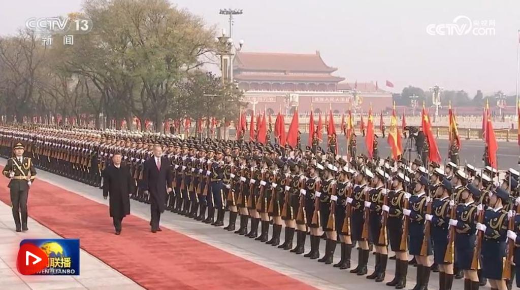 費(fèi)利佩六世抵達(dá)時(shí),禮兵列隊(duì)致敬。習(xí)近平同費(fèi)利佩六世登上檢閱臺(tái),軍樂團(tuán)奏中西兩國(guó)國(guó)歌,天安門廣場(chǎng)鳴放禮炮21響。費(fèi)利佩六世在習(xí)近平陪同下檢閱中國(guó)人民解放軍儀仗隊(duì),并觀看分列式。