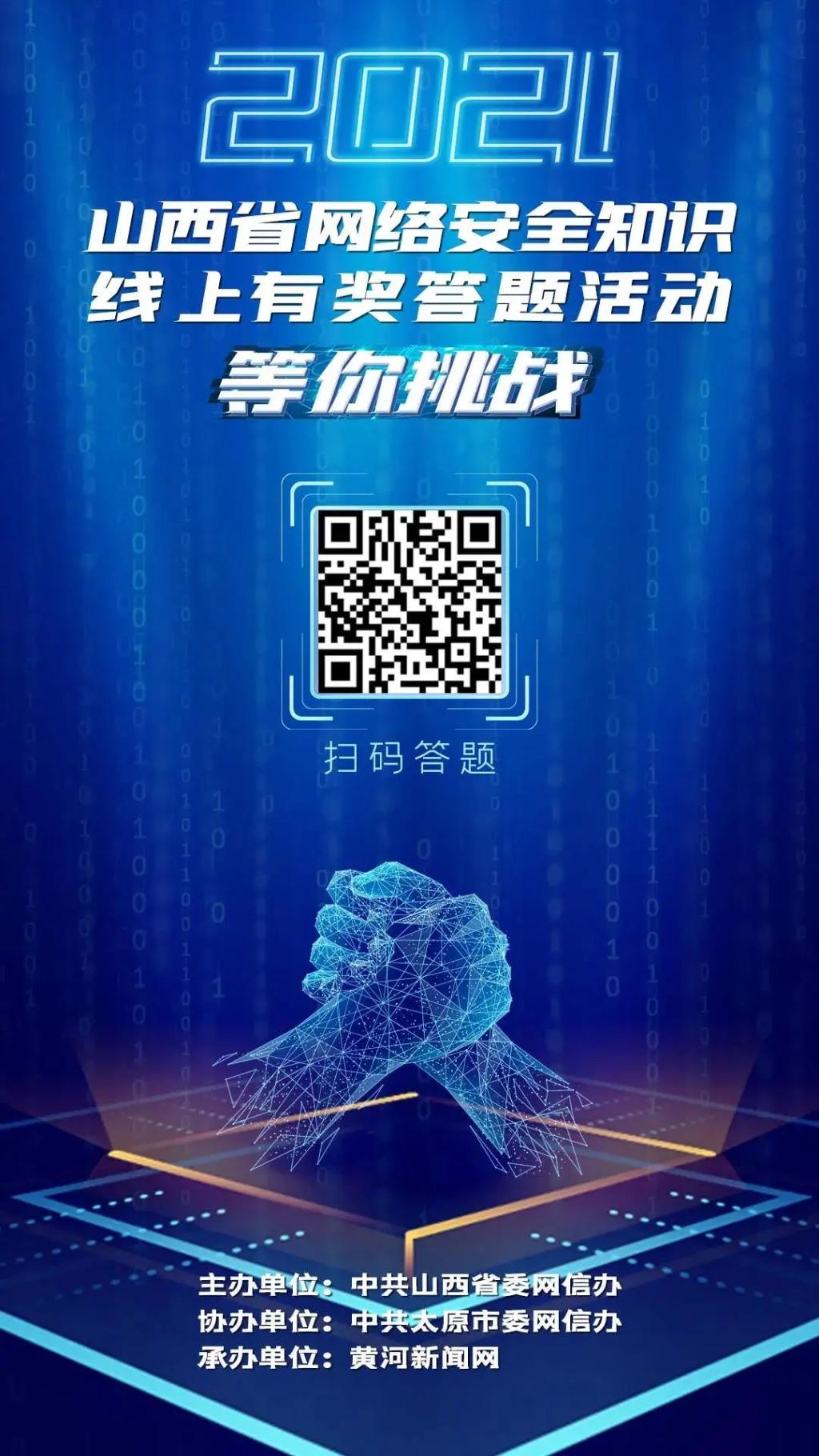 為深入宣傳貫徹《中華人民共和國網(wǎng)絡安全法》等相關法律法規(guī),進一步普及網(wǎng)絡安全知識,提升全社會網(wǎng)絡安全意識和防護技能,在2021年國家網(wǎng)絡安全宣傳周期間,由中共山西省委網(wǎng)信辦主辦、中共太原市委網(wǎng)信辦協(xié)辦、黃河新聞網(wǎng)承辦的“2021山西省網(wǎng)絡安全知識線上有獎答題活動”于10月9日正式啟動。