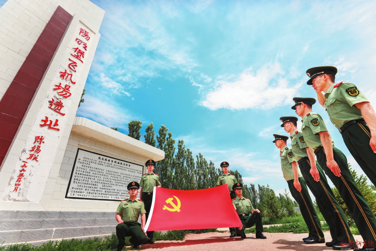理想如磐,信念如鋼?!捌咭弧鼻跋?,武警山西總隊忻州支隊組織黨員在“陽明堡飛機(jī)場遺址”重溫入黨誓詞。 楊旭東攝