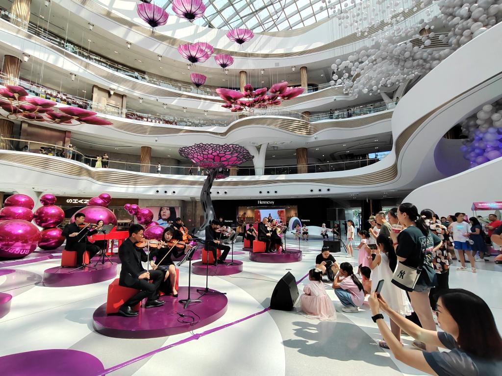 端午假期,??趪H免稅城內(nèi),伴隨著悠揚(yáng)的音樂,陽光傾瀉“天際秘林”夢幻舞臺,正在購物的游客們紛紛駐足欣賞。“一場室內(nèi)音樂會,給購物消費(fèi)增添了新意和氛圍感?!焙?谑忻耜惱俪两陉柟夂鸵魳分?。