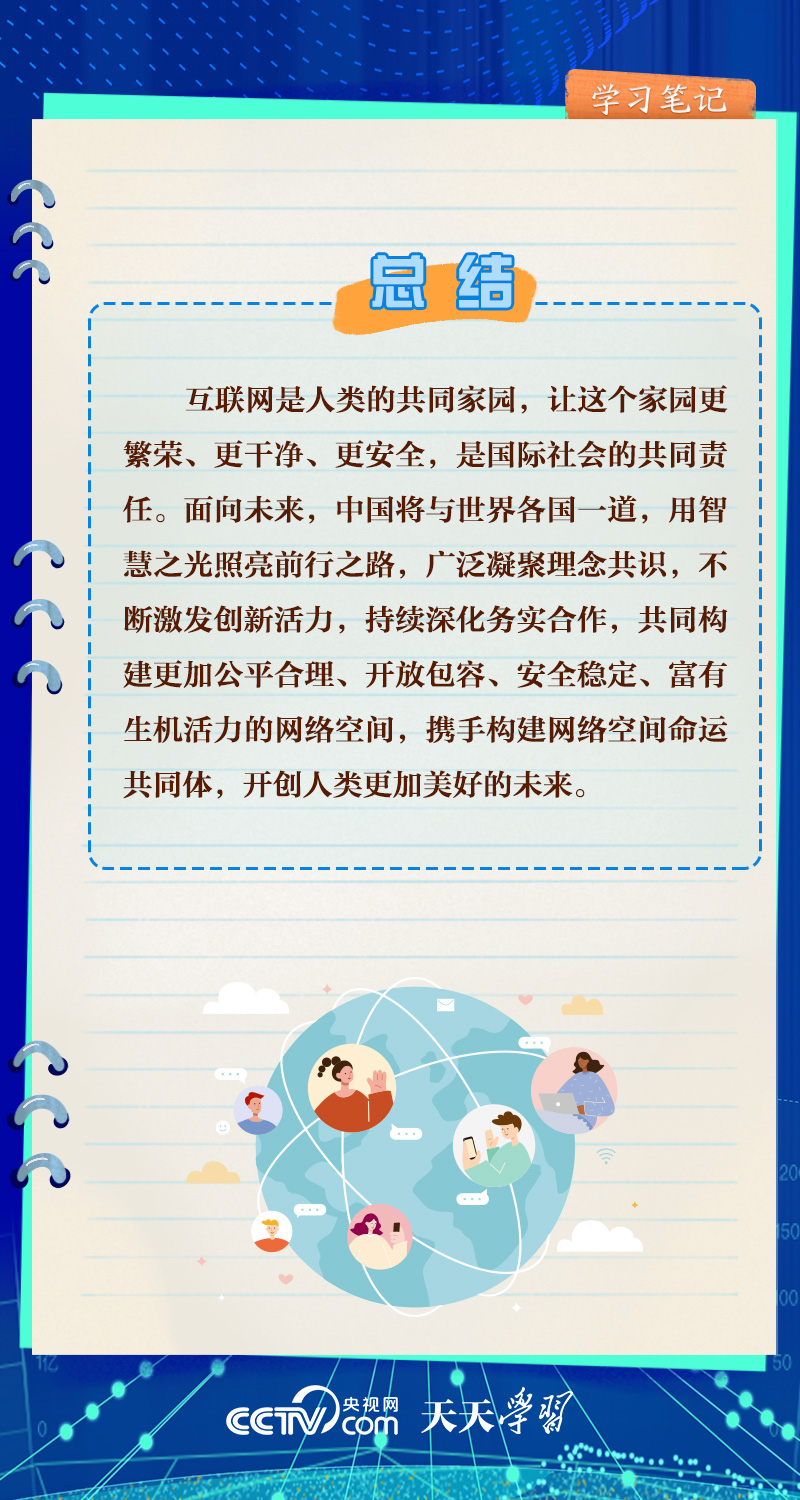 天天學(xué)習(xí)“互聯(lián)網(wǎng)發(fā)展是無國界、無邊界的,利用好、發(fā)展好、治理好互聯(lián)網(wǎng)必須深化網(wǎng)絡(luò)空間國際合作,攜手構(gòu)建網(wǎng)絡(luò)空間命運共同體。”面對日益發(fā)展擴大的網(wǎng)絡(luò)空間,習(xí)近平主席倡導(dǎo)構(gòu)建網(wǎng)絡(luò)空間命運共同體,為推動全球網(wǎng)絡(luò)空間互聯(lián)互通、共享共治注入中國智慧。
