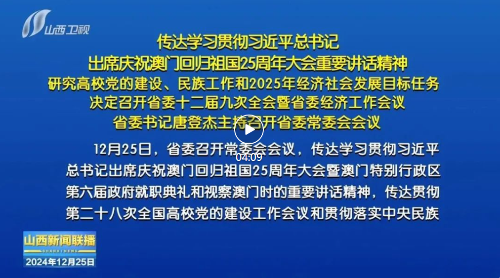 山西日?qǐng)?bào)報(bào)道 12月25日,省委召開常委會(huì)會(huì)議,傳達(dá)學(xué)習(xí)貫徹習(xí)近平總書記出席慶祝澳門回歸祖國25周年大會(huì)暨澳門特別行政區(qū)第六屆政府就職典禮和視察澳門時(shí)的重要講話精神,傳達(dá)貫徹第二十八次全國高校黨的建設(shè)工作會(huì)議和貫徹落實(shí)中央民族工作會(huì)議精神經(jīng)驗(yàn)交流會(huì)精神,研究2025年經(jīng)濟(jì)社會(huì)發(fā)展主要指標(biāo)及財(cái)政收支計(jì)劃安排,決定于近日召開省委十二屆九次全會(huì)暨省委經(jīng)濟(jì)工作會(huì)議。省委書記唐登杰主持會(huì)議。