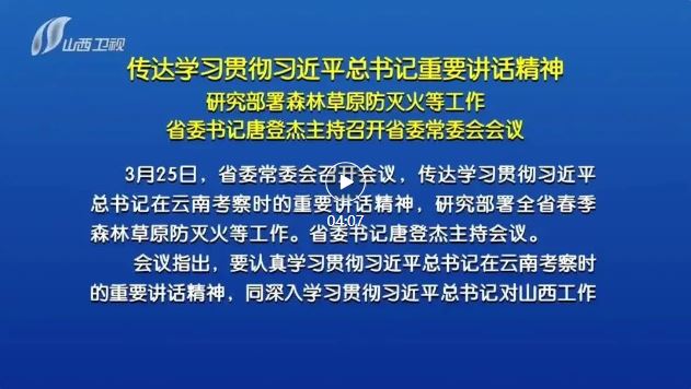 山西日報報道 3月25日,省委常委會召開會議,傳達學習貫徹習近平總書記在云南考察時的重要講話精神,研究部署全省春季森林草原防滅火等工作。省委書記唐登杰主持會議。