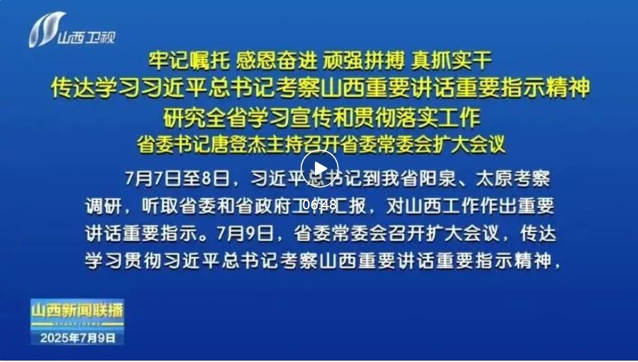 7月7日至8日,習(xí)近平總書記到我省陽泉、太原考察調(diào)研,聽取省委和省政府工作匯報(bào),對(duì)山西工作作出重要講話重要指示。7月9日,省委常委會(huì)召開擴(kuò)大會(huì)議,傳達(dá)學(xué)習(xí)貫徹習(xí)近平總書記考察山西重要講話重要指示精神,認(rèn)真落實(shí)黨中央關(guān)于促進(jìn)中部地區(qū)加快崛起、推動(dòng)黃河流域生態(tài)保護(hù)和高質(zhì)量發(fā)展等戰(zhàn)略部署,堅(jiān)持穩(wěn)中求進(jìn)工作總基調(diào),完整準(zhǔn)確全面貫徹新發(fā)展理念,統(tǒng)籌好發(fā)展和安全,努力在推動(dòng)資源型經(jīng)濟(jì)轉(zhuǎn)型發(fā)展上邁出新步伐,奮力譜寫三晉大地推進(jìn)中國(guó)式現(xiàn)代化新篇章。省委書記唐登杰主持會(huì)議。