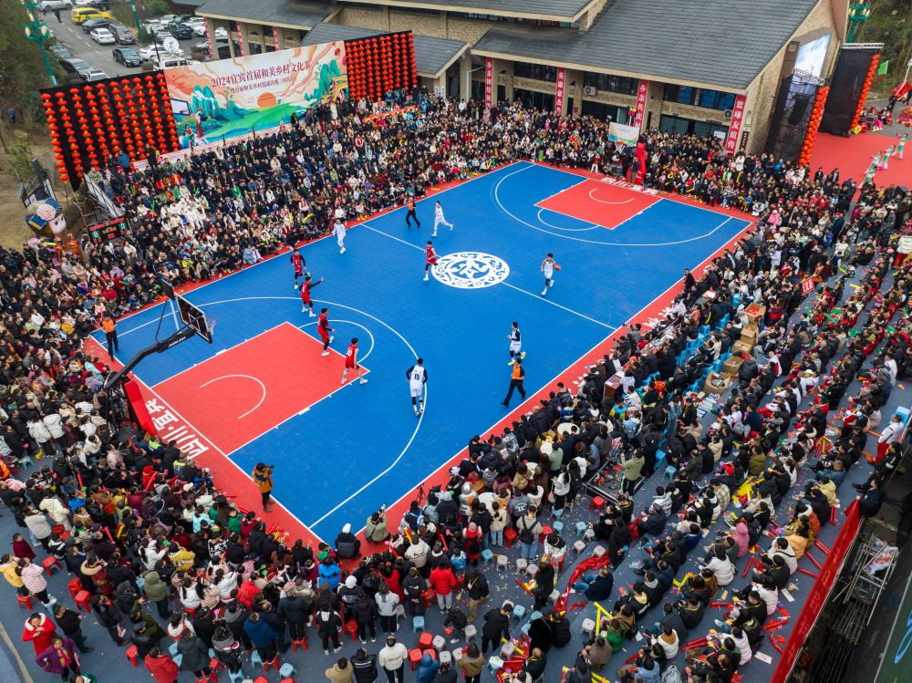 2024年1月29日,村民、游客在現(xiàn)場觀賽(無人機照片)。當(dāng)日,在四川省宜賓市珙縣巡場鎮(zhèn)三合村,2024宜賓首屆和美鄉(xiāng)村文化節(jié)暨首屆和美鄉(xiāng)村籃球決賽(村BA)舉行,同時,現(xiàn)場還舉行了非遺年貨購物節(jié)、消費券發(fā)放等活動,以賽事經(jīng)濟激發(fā)鄉(xiāng)村活力。新華社發(fā)(莊歌爾攝)