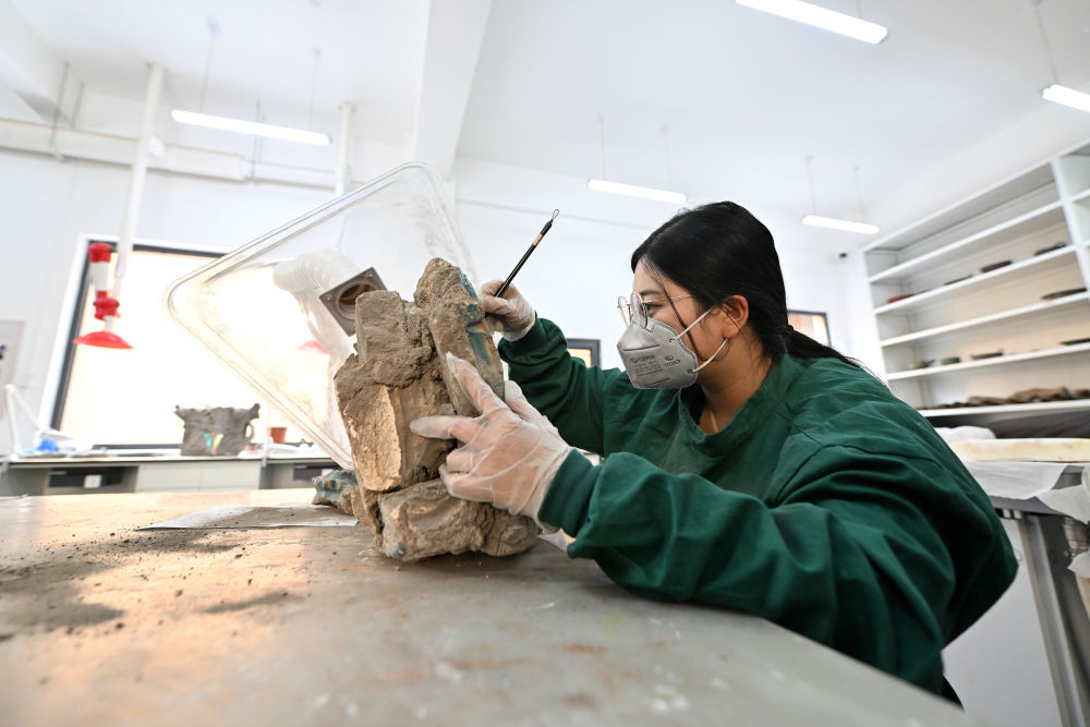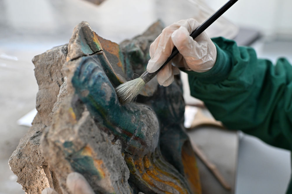在云岡研究院可移動(dòng)文物修復(fù)室,工作人員韓躍華在進(jìn)行除塵作業(yè)(2024年2月26日攝)。
