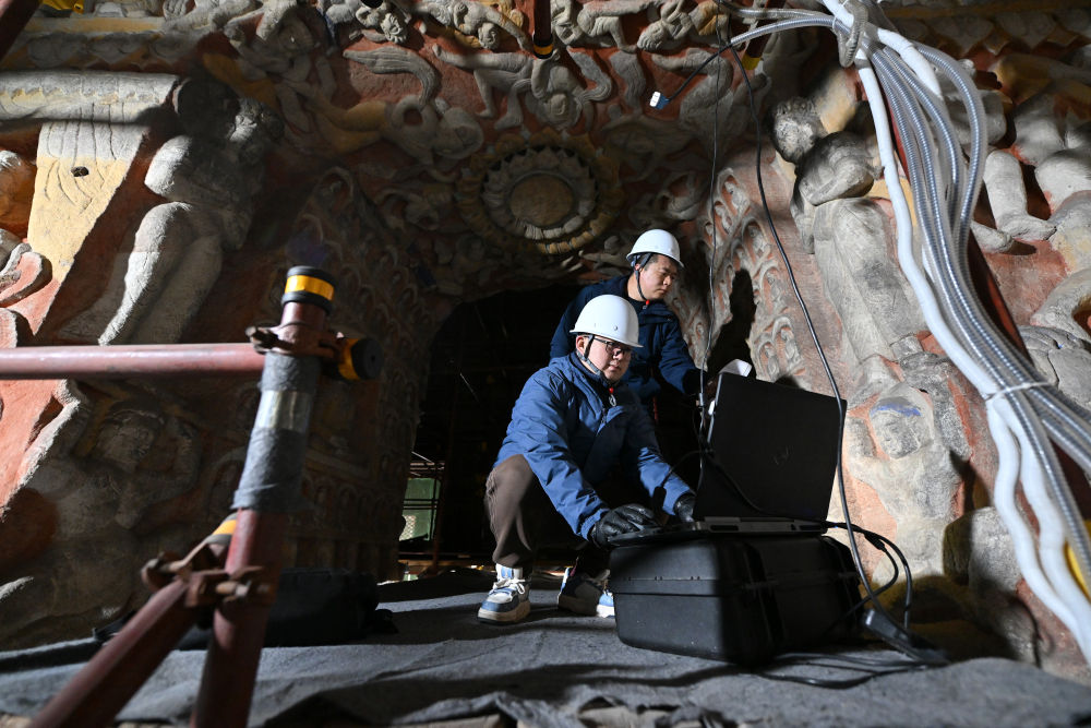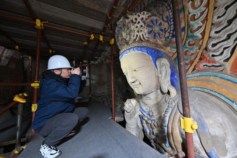 云岡研究院數(shù)字化保護(hù)中心工作人員潘鵬(前)和同事杜強(qiáng)在云岡石窟第10窟進(jìn)行數(shù)據(jù)采集(2024年2月27日攝)。