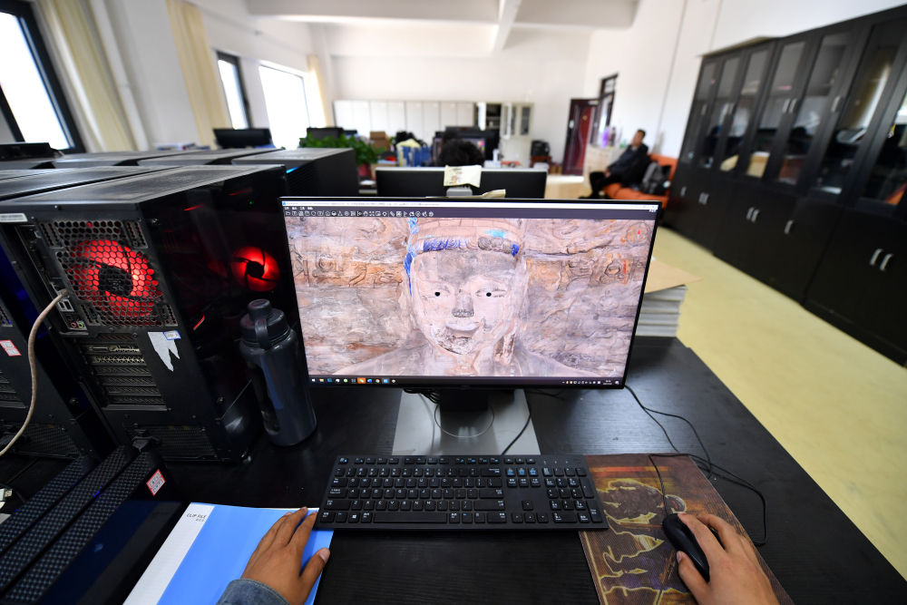 云岡研究院數(shù)字化保護(hù)中心工作人員在電腦上查看云岡石窟第13窟的模型(2021年5月8日攝)。
