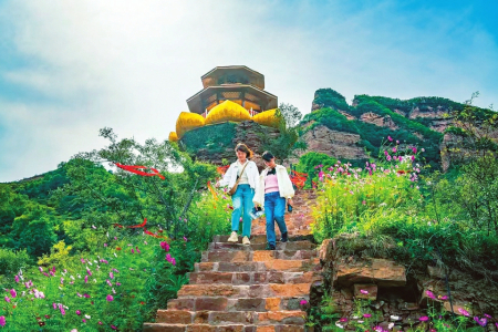 黃崖洞文化旅游區(qū)赤壁丹崖如屏如畫(huà),林蔭如蓋、疊瀑成群,吸引游客紛至沓來(lái)。張斌全攝