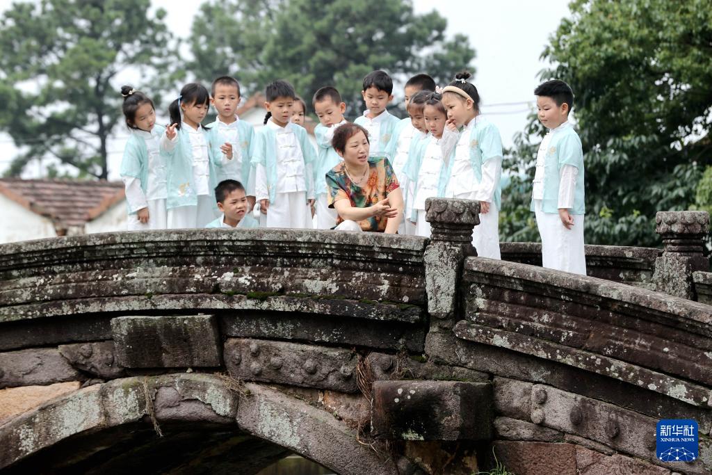 6月26日,在德清縣新安鎮(zhèn)舍北村,文化志愿者給孩子們講述萬善橋的歷史知識(shí)。(新華社發(fā) 謝尚國(guó) 攝)