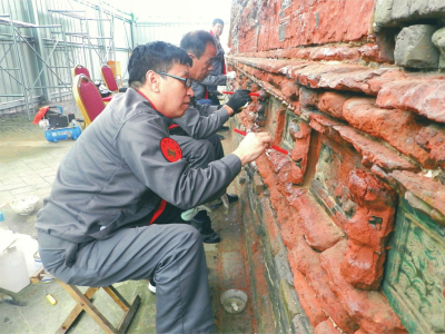 專家正在對四龍壁進(jìn)行修復(fù)。解州關(guān)帝廟文物保護(hù)所供圖