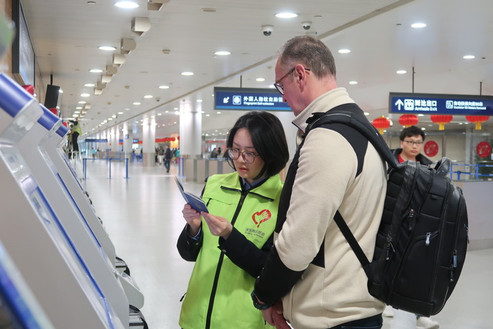 上海機場邊檢“百人外語志愿服務隊”民警正在協(xié)助外國旅客辦理入境手續(xù)。新華社記者唐斯琦 攝