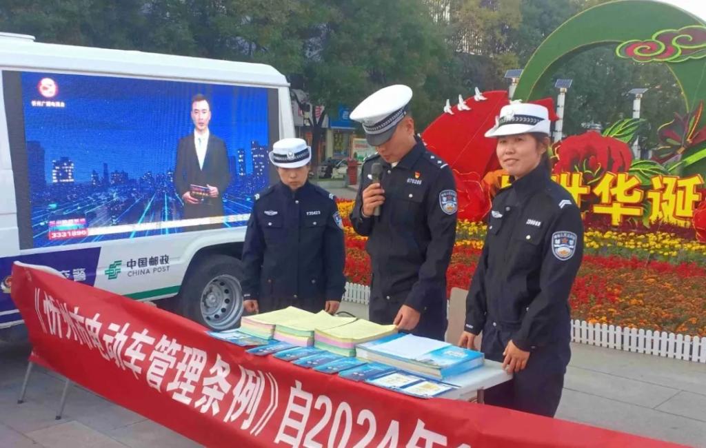 在人頭攢動的廣場上,“一盔一帶”宣傳展板、警郵直播車大屏幕吸引了過往群眾駐足觀看?!按髬專滦抻喌摹缎弥菔须妱榆嚬芾?xiàng)l例》已于本月1日起開始施行,您知道嗎?”“大叔,您這舊的電動自行車要抓緊時間登記備案、辦理臨時牌照,咱忻府區(qū)24個警郵合作電動自行車便民登記服務(wù)網(wǎng)點(diǎn)都能辦理過渡期臨牌”“騎乘電動自行車必須要佩戴安全頭盔,不能闖紅燈、逆行......”