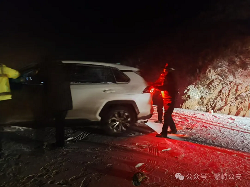2024年11月25日晚18時(shí),繁峙縣公安局指揮中心接到廣東游客趙岸華的報(bào)警求助電話(huà),聲稱(chēng)其一行四人駕車(chē)從河北來(lái)五臺(tái)山旅游,行至太行一號(hào)旅游公路神堂堡繁五交界路段時(shí),因風(fēng)雪交加、道路結(jié)冰,車(chē)輛和人員被困。接到報(bào)警后,指揮中心立即通知神堂堡派出所和交警中隊(duì)前往救助。救援民警頂風(fēng)冒雪順著太行一號(hào)旅游公路沿路搜尋,經(jīng)過(guò)3個(gè)多小時(shí)的艱難跋涉,終于在神堂堡鄉(xiāng)盤(pán)道村往南約5華里的路上(已屬五臺(tái)山風(fēng)景區(qū)地界)找到了被困車(chē)輛。當(dāng)時(shí)該車(chē)燃油即將耗盡,車(chē)上四人凍得瑟瑟發(fā)抖,救援民警當(dāng)即將3名乘客轉(zhuǎn)移至警車(chē)上,并協(xié)助拖車(chē)司機(jī)將被困車(chē)輛連上拖車(chē)后原路折返,最終在11月26日凌晨2時(shí)將被困游客和車(chē)輛安全營(yíng)救回派出所。
