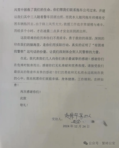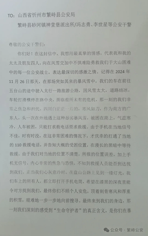 2025年1月1日,繁峙縣公安局收到了來(lái)自廣東省佛山市市民趙岸華等4人聯(lián)名寄來(lái)的感謝信,信中表達(dá)了對(duì)繁峙公安局神堂堡派出所民警頂風(fēng)冒雪深夜馳援,及時(shí)救助其脫險(xiǎn)的感激之情。