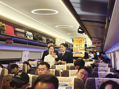 4月22日一早,在太原開往北京的書香列車上,山西晚報記者看到了這樣一幕。車廂內(nèi),兩側(cè)車窗、行李架、衛(wèi)生間、洗漱臺等處張貼全民閱讀大會標(biāo)識,營造了濃厚的活動氛圍。列車視頻和廣播循環(huán)播放全民閱讀大會宣傳片,介紹大會概況及“書香列車”情況。幾名年輕乘客圍在列車餐吧臺增設(shè)的“讀書角”,選取自己喜歡的讀物。列車工作人員利用流動小車,送書到車廂,為旅客提供圖書借閱服務(wù)。在車廂兩端、每個座位頭枕巾上張貼、印刷全民閱讀大會主題海報和“書香列車云閱讀”二維碼,不少旅客掃碼開始免費(fèi)聽書、看書。
